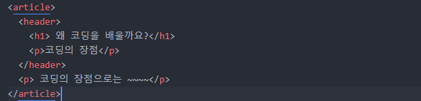 <article>은 독립적인 컨텐츠들을 명시할 때 사용됩니다. 예를들어 블로그 글, 뉴스 기사 같은 내용이 들어갑니다. 여기서 중요한건 <article>을 작성할 때는 항상 <h1> 같은 headings가 꼭 들어가야합니다.