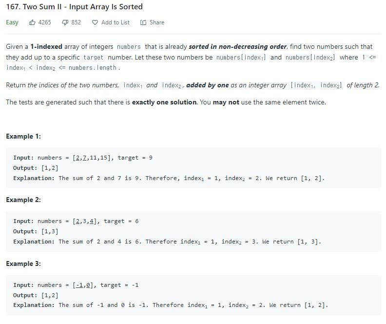 Two Sum과 Binary Search의 개념을 이용해서 풀 수 있는 간단한 문제 문제 - 정렬된 배열에서 target이 되는 값을 찾아 index + 1 되는 배열을 return하기 해결방법 - 배열이 이미 정렬되어 있어서 Binary Search를 사용 class Solution { public int[] twoSum(int[] numbers, int target) { int start = 0; int end = numbers.length - 1; int[] output = new int[2]; while (end > start) { int sum = numbers[start] + numbers[end]; if (sum == target){ output[0] = start + 1; output[1]..