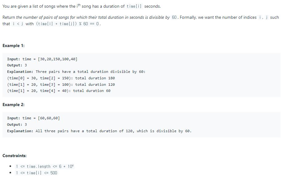 문제 - 두 가지 곡 시간의 합이 60으로 나뉘어지는 Pair의 수를 찾아라 해결방법 1. Brute Force를 이용해서 곡 pair의 합이 60으로 나뉘어지는 곡들 찾기 2. 각 곡들의 시간을 60으로 나누었을 때 나머지 값이 같은 곡이 있다면 +1 해주기. class Solution { public int numPairsDivisibleBy60(int[] time) { int output = 0; int size = time.length; for (int i = 0; i < size; i++){ for(int j = i+1; j < size; j++){ int totalTime = time[i] + time[j]; if (totalTime % 60 == 0){ output++; } } } retur..