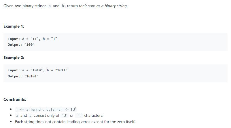 문제 - String으로 주어진 Binary 두 개를 더하기 해결방안 - 케이스별로 String에 char을 추가해주기 - char이 추가될 때 정답의 반대 방향으로 추가되기 때문에 마지막에 reverse 사용해주기 Steps Step 1 StringBuilder output = new StringBuilder(); int aSize = a.length() - 1; int bSize = b.length() - 1; boolean two = false; 리턴 할 변수, 두 string의 사이즈 그리고 2가 나왔을 때 0을 더해 줄 변수를 선언해줍니다. Step 2 while(aSize >= 0 || bSize >= 0){ //if the size of inputs is not the same, use '0..